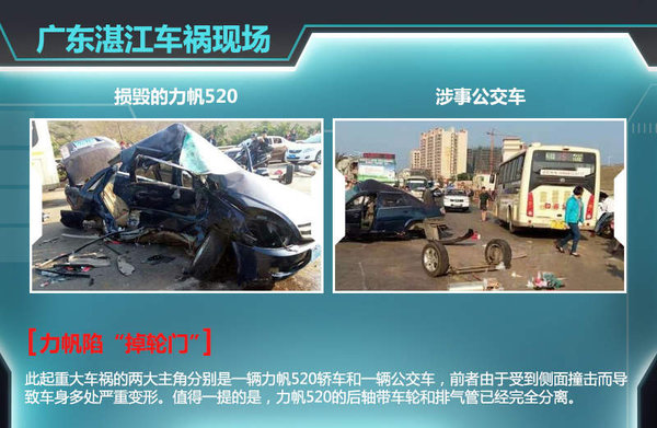 根据从事故现场拍摄的图片来看,此起重大车祸的两大主角分别是一辆力帆520轿车和一辆公交车,前者由于受到剧烈的侧面撞击而导致车身严重变形。但令人意外的是力帆520轿车的后轴带车轮以及排气管已经完全处于分离状态。部分力帆车主对此车祸称为力帆“掉轮门”。