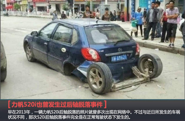 事实上,这已不是力帆旗下车型第一次发生后轴脱落现象。早在2013年,一辆力帆520i便在正常驾驶过程中出现了类似事件。