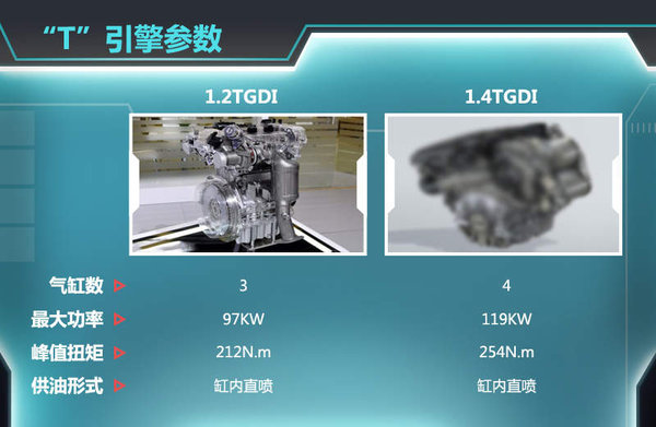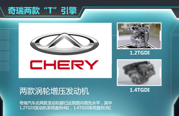 奇瑞即将投产的两款“T”引擎都已达到国内领先水平。其中1.2TGDI发动机采用直列3缸排列方式,拥有缸内直喷、可变气门正时、增压中冷技术,最大功率97KW,峰值扭矩达到212N.m。1.4TGDI发动机采用直列4缸,最大功率119KW,峰值扭矩达到254N.m。