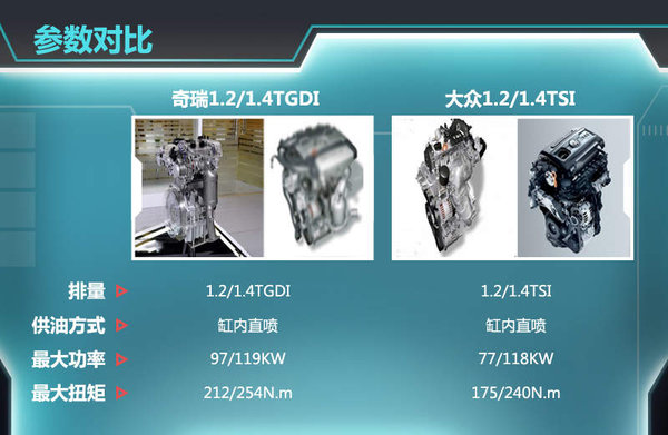 值得一提的是,奇瑞新缸内直喷增压发动机参数确实足够抢眼,动力性能超越国内知名的大众TSI系列增压引擎。目前,大众发动机代号为EA111的1.2TSI发动机,最大功率77KW,峰值扭矩达到175N.m,1.4TSI发动机最大功率118KW,峰值扭矩达到240N.m。相比奇瑞1.2L、1.4L TGDI发动机的动力参数有着一定的差距。