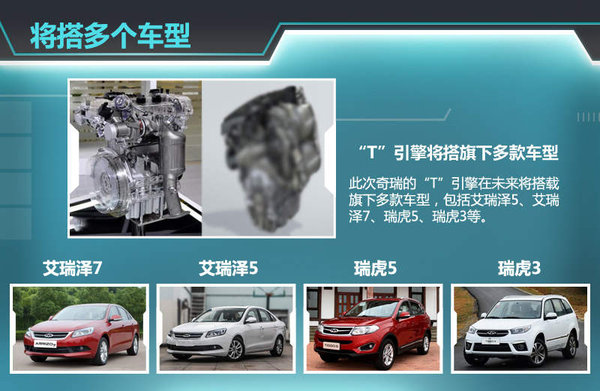 后续奇瑞两款“T”引擎投产后,规划搭载到旗下多款车型,包括艾瑞泽5、艾瑞泽7、瑞虎5、瑞虎3等。随着新引擎的加入,奇瑞在动力方面的发展将更加完善。两款直喷增压发动机先进的技术与小排量的环保将使奇瑞后续车型更具竞争力。