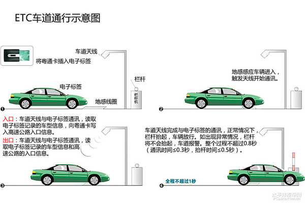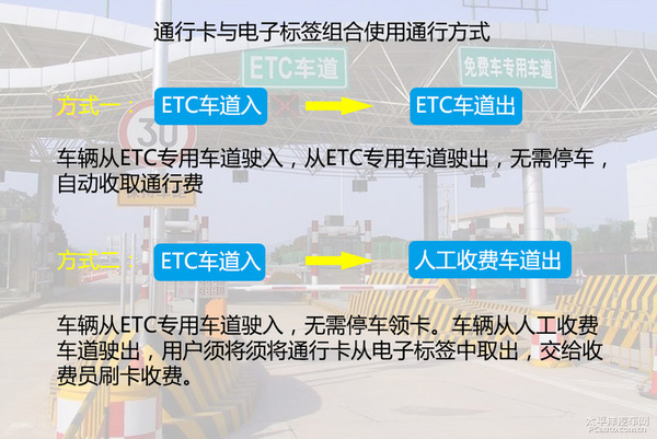 在设有ETC车道的收费站,用户可将通行卡插入电子标签,以不停车方式通行ETC车道。在未设ETC车道的收费站,用户须将通行卡从电子标签中取出,以停车刷卡方式通过。