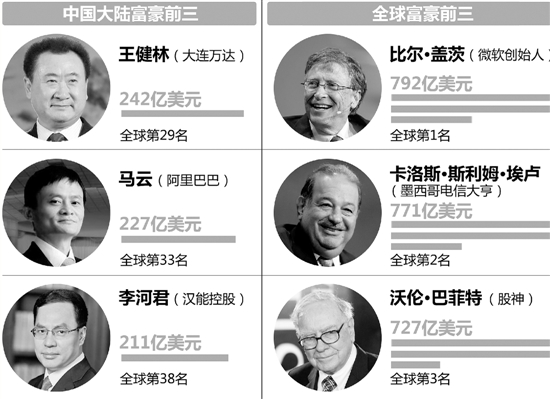美国著名杂志《福布斯》2日公布的2015年全球亿万富豪排行榜显示,59岁的微软创始人比尔·盖茨以792亿美元的净资产蝉联全球首富宝座,中国大陆富豪中,王健林力压马云,再度成为中国大陆首富。