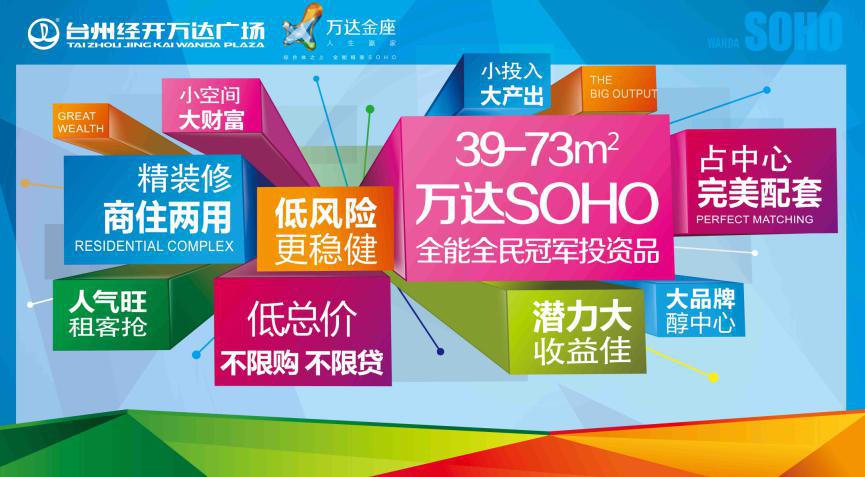 40-70㎡万达SOHO,精装修、低总价、不限贷、不限购,空间灵活、任意分割,万达广场之上,机遇多,有面子,共享万达商圈强大商业资源。万达精装SOHO,台州青年创业首选。