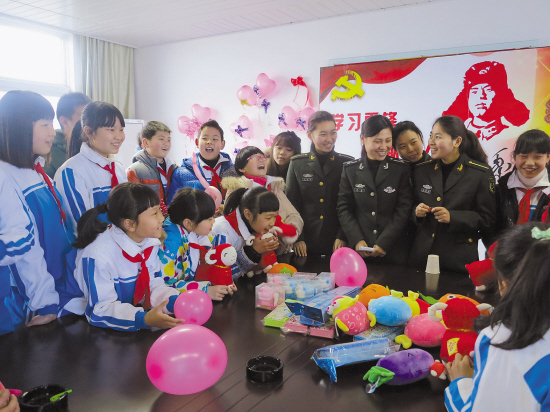 三八节前夕,温岭市石塘小学的少先队员们,在老师的带领下,登上雷公山民兵哨所,和不辞劳苦、长期坚守岗位的女民兵阿姨们一起过节。
