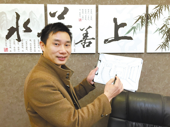 “最初时候,我做的是木工活,之后在工作中慢慢学习设计,如今也算是个老设计师了。”数分钟时间,白纸上便出现了一款别墅大厅的设计小样,他歪头思考了一番,又添置了几处细节花样。