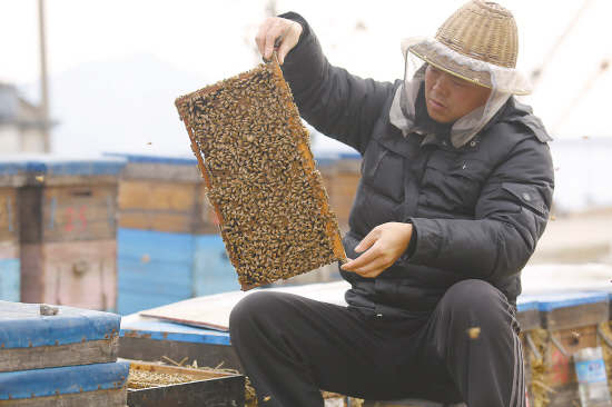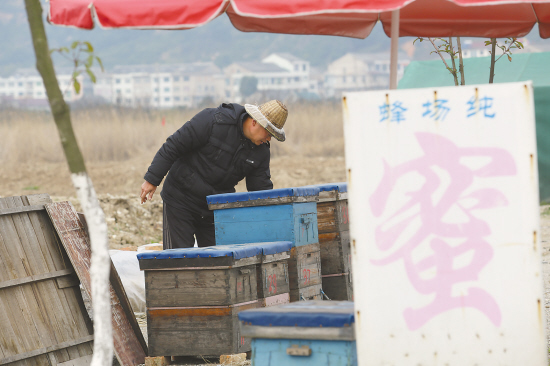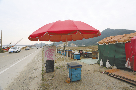 去年,江苏人鲁师傅和妻子带着60余个蜂箱辗转到了临海沿江镇,在路旁一块靠近橘园的空地上“安营扎寨”下来。“这里春天有油菜花,有橘花。”凭着30多年的养蜂经验,鲁师傅觉得这里是个采蜜的“宝地”。