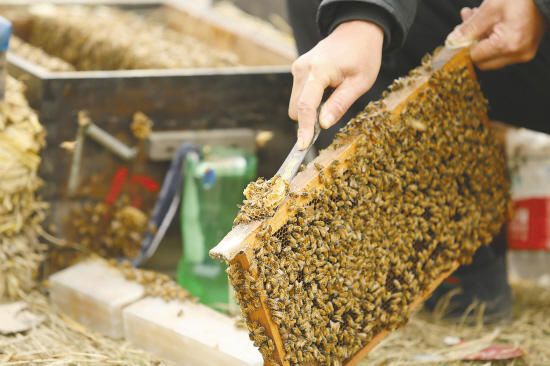 在这个棚子外面的空地上,记者看到摆放着一个个蜂箱,不时有蜜蜂在飞舞。鲁师傅说,这一排排蜂箱是他们最重要的家当。蜂箱就像是一个酿蜜工厂,蜜蜂采完蜜后,就会回到蜂箱,然后在蜂脾上酿蜜。春暖花开的时候,一个蜂箱大概两三天就会满了,这也是他们最忙碌的时候。