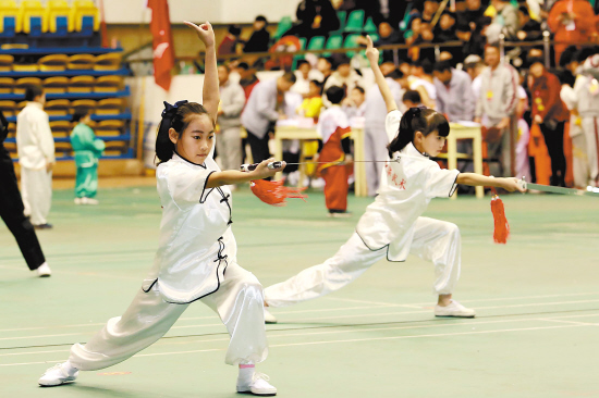 3月14日,“桔乡杯”台州市第九届武林大会在黄岩体育馆举行。活动吸引了全市86个代表队748名武林高手同台竞技,刀、枪、剑、棍等连番上阵,让观众大饱眼福。近年来,我市越来越多的人开始练习武术,以达到强身健体的目的。本次参赛者中,儿童组年龄最小的只有3周岁,老年组都为60岁以上。图为武术展示现场。