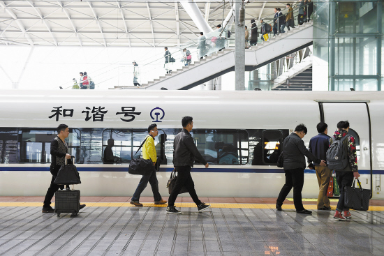 3月15日,一辆温州南至南京的动车正准备停靠台州火车站,一些旅客正匆匆往返。当天是2015年春运最后一天。杨辉摄