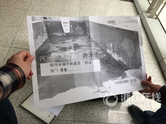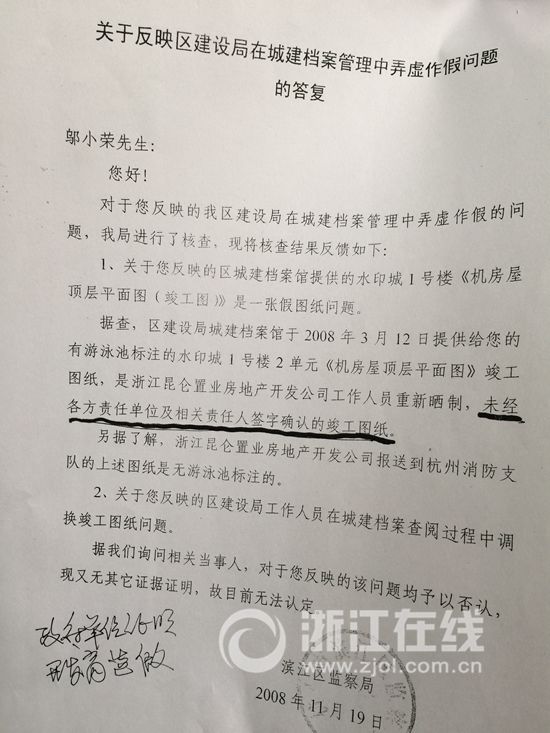2008年3月,和开发商协商不成的邬先生找到滨江区建设局城建档案馆,查询他购买房子的屋顶平面图,“当时,查到我购买房子的屋顶平面图,是没有标注游泳池的,但天台标注游泳池”。同年8月,邬先生向滨江区纪检委投诉,经过调查,标注了楼顶游泳池的水印城1号楼《机房屋顶层面平面图》是一张假图,是浙江省昆仑置业房地产开发公司工作人员重新晒制,未经各方责任单位及相关负责人签字确认的竣工图纸。