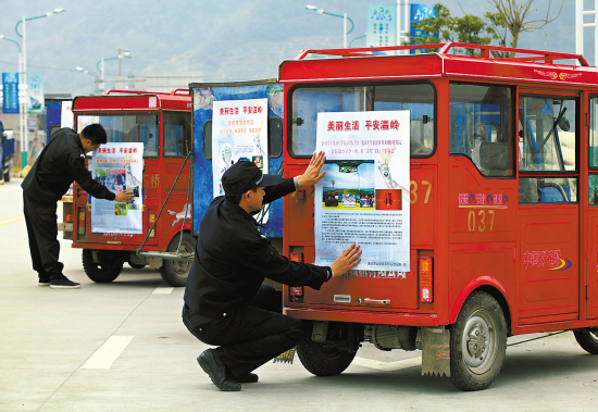 3月14日,温岭市石桥头派出所民警在三轮车上张贴禁毒宣传海报。