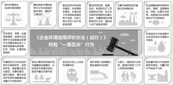 哪些企业会被列入“黑名单”?征求意见稿说,主要是全省各级环保部门,在日常环境监管执法中,发现存在《企业环境信用评价办法(试行)》第十五条所列“一票否决”行为的(见图),经集体审议后,就将被列入环境违法企业“黑名单”。