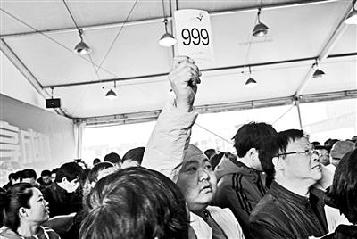 昨日上午10时30分许,拍卖现场的工作人员走上拍卖席,宣布开始竞拍后,围在竞拍现场周围的竞拍者便立即涌入竞拍场地。由于现场没有设置座椅,所有的竞拍者都是全程站着参与竞拍。当拍卖师走上竞拍席后,台下喧闹的众人便安静了下来。“我是拍卖师,大伙可能没看见,其实我身后还写着10个字:拍卖有风险,竞拍需谨慎。不过,还得加个括号,里面写的是有钱任性除外。”拍卖一开始,拍卖师的这句玩笑话就逗乐了众人,其实,在拍卖师的身后,什么字也没有写。