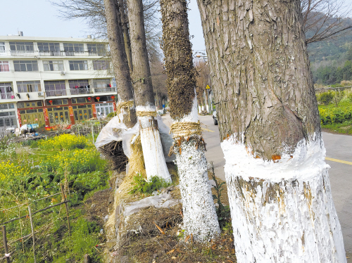 昨日下午,本报“民情365”记者再次前往章安街道合旗村,看到这10株水杉已经做上了后续“保护措施”。水杉被割伤处已抹上了石膏,还包了一圈稻草。难道是公路管理部门进行的紧急补救措施?