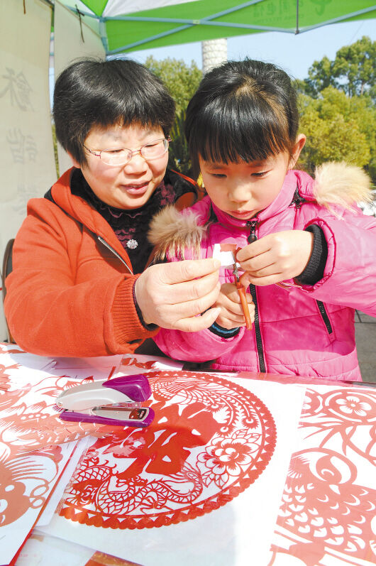 临海剪纸传人张秀绢正向小市民传授剪纸技艺。