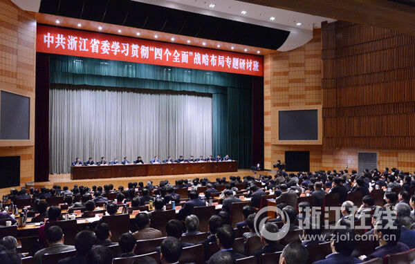 夏宝龙强调,落实“四个全面”战略布局,必须坚持以“八八战略”为总纲,以干在实处、走在前列的实际行动,努力推动“四个全面”战略布局在浙江的实践。要围绕全面建成小康社会,咬定干好“一三五”、实现“四翻番”的目标不动摇,坚定不移打好转型升级组合拳,坚持把创新作为发展的核心驱动力,照着“绿水青山就是金山银山”的路子走下去,以更大的力度统筹城乡区域发展,坚持“群众想什么,我们就干什么”,坚持一手抓“经济报表”一手抓“平安报表”,推动新常态下的新发展,为全国大局作出新贡献。要围绕全面深化改革,坚持问题导向、围绕全局指向、强化市场取向、尊重群众意向、纠正利益偏向,切实抓好各项改革举措的落实,努力再创体制机制新优势。要围绕全面依法治国,增强运用法治思维和法治方式的能力水平,紧紧抓住领导干部这个“关键少数”,加快建设法治政府,加强和改进政法工作,发挥好人大、政协在法治建设中的“一线”作为,围绕“三改一拆”、“五水共治”等重点工作拓展法治实践平台,努力在法治建设上继续走在前列。要围绕全面从严治党,聚精会神抓党建,深入学习习近平总书记系列重要讲话精神,把政治纪律作为最大的规矩,打好意识形态斗争主动仗,打造“狮子型”干部队伍,树立大抓基层的工作导向,从严从实改作风、正作风,坚决落实党风廉政建设“两个责任”,为改革发展各项工作提供根本保证。