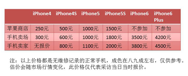 在他们的回收体系当中,iPhone4已经没有回收渠道,所以一般不报价,而iPhone4S的价格是800元左右,iPhone5的价格是1100元左右,iPhone5S的价格是2000元左右,iPhone6的价格是3800元左右,iPhone6 Plus的价格是4500元左右。
