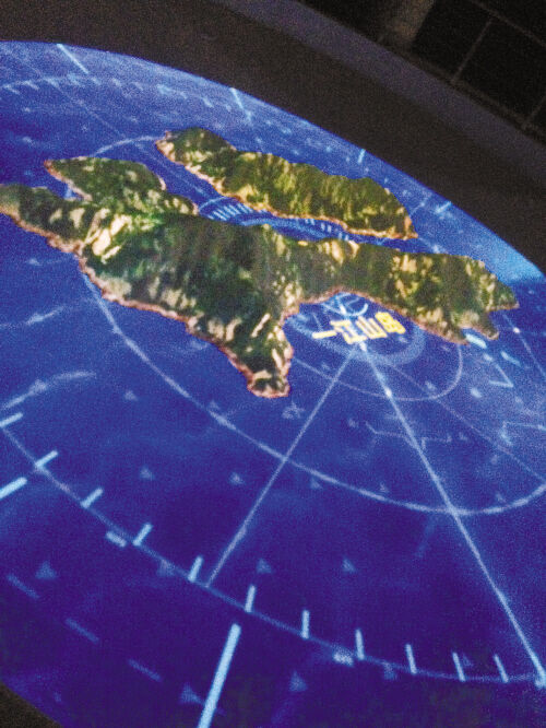 在纪念馆展厅北侧一端有个两层通高的展示空间,炫酷的一江山岛数字模拟沙盘就在这里。这是国内首个、也是唯一一个以军事为题材的数字模拟沙盘。每天四次的放映时间一到,展厅灯光倏然变暗,伴随着环绕立体声的解说词与恢宏的背景音乐,通过光、电演示,模拟沙盘上从清波拍岸,到硝烟四起,随着光点的腾挪闪转,一江山岛登陆战的双方对战全程生动再现。炫酷程度堪比看了一部美国大片。