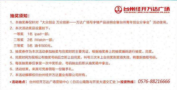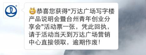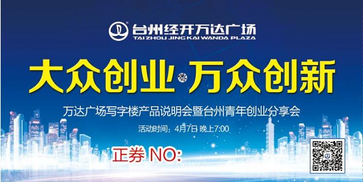 4月7日“大众创业万众创新——万达广场写字楼产品说明会暨台州青年创业分享会”门票即刻开抢!我们将抽出20名幸运粉丝,每人可获分享会入场邀请函一张。