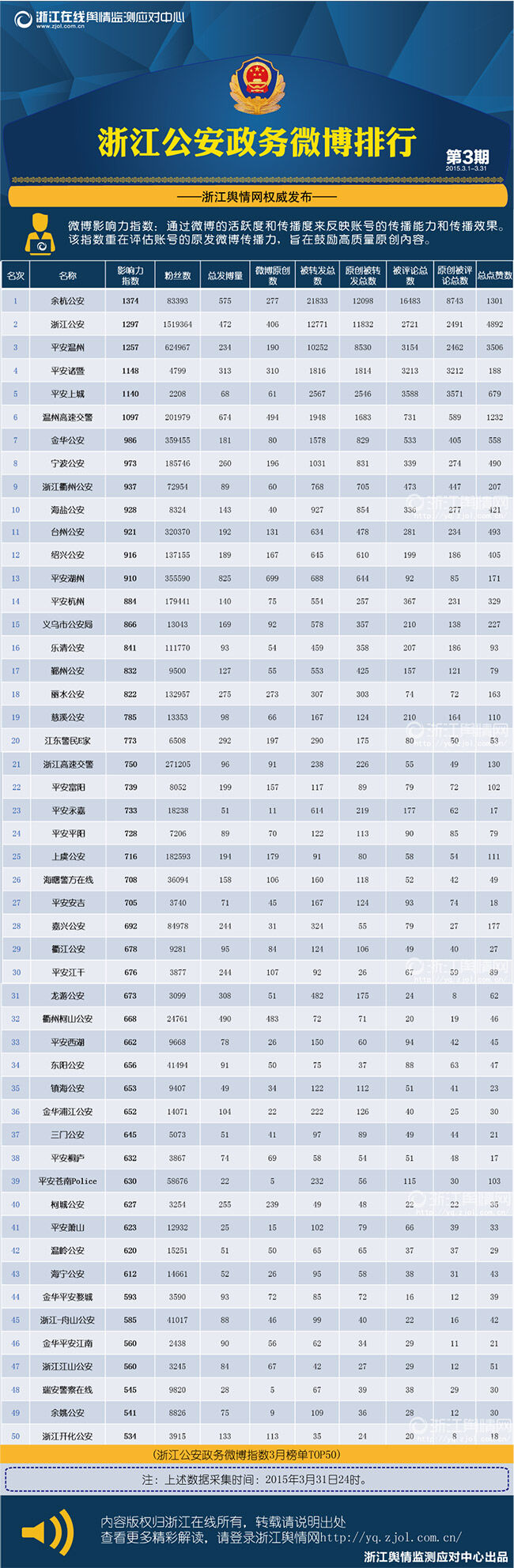 “平安湖州”蝉联“首席原创”。3月份,124个账号共发微博12474条,较上月的10377条增加2097条,其中原创微博共计8014条,亦超过上月的6744条。“平安湖州”连续三月占据原创微博榜第一席位,成为勤劳“刷屏”的“首席原创”,敬业精神值得称赞。不过,“湖州开发区公安”却与“浙江-舟山新城公安”、“浙江警方时空”一起开了天窗,这鲜明的对比还是有点夸张啊。