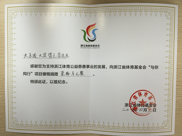 在浙江省体彩中心进行兑奖流程时,老刘找到工作人员悄悄地问:“我想捐10万,你们这里怎么办理?”在工作人员的简单介绍省体彩中心所做的公益项目之后,老刘选择捐献给浙江省体育基金会的“与你同行”关爱基金。据了解,“与你同行”关爱基金是浙江省体育基金会开设的多项基金之一,将主要用于资助优秀运动员和家庭困难但具有体育天赋的青少年参加各级体校训练,帮助他们成为为国争光、服务社会大众的优秀体育后备人才。