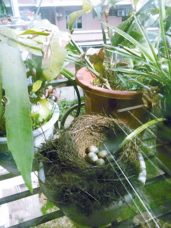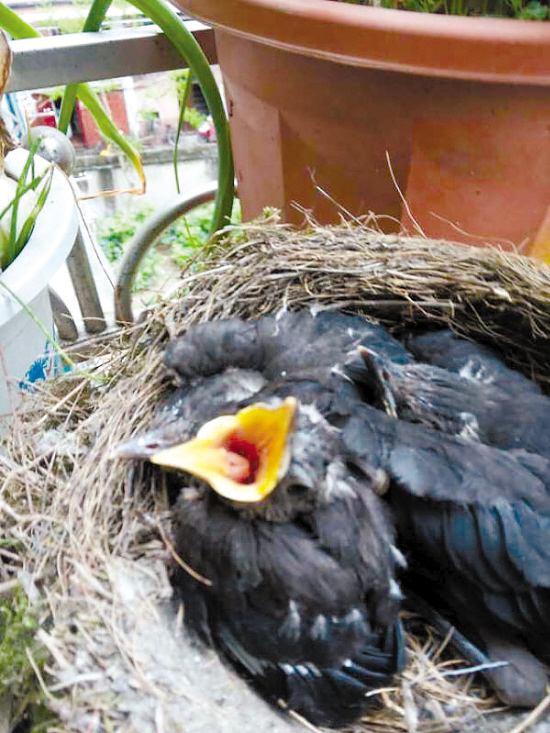 最近,椒江的林先生整天乐呵呵的,因为他们家里来了一群“不速之客”,一只乌鸫将它们的家安在了阳台上,这让退休了的老林生活多了不少乐趣。