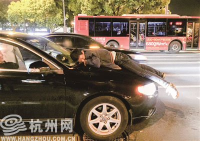 昨晚8点30分,宁波江东中兴路上,一个30岁左右的男子,趴在一辆轿车上,一动不动。