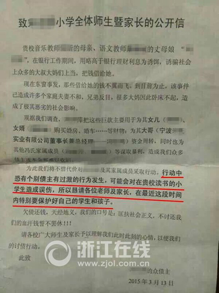 教育局工作人员称,除了两位老师与债主存在血缘关系外,整件事情与校方无关,“不过,确有几位情绪激动的债主拿着这份打印好的公开信,来到校长室”,事发后,教育部门已将此事报送给鄞州区维稳办和警方处理,期间学校并未出现任何意外。