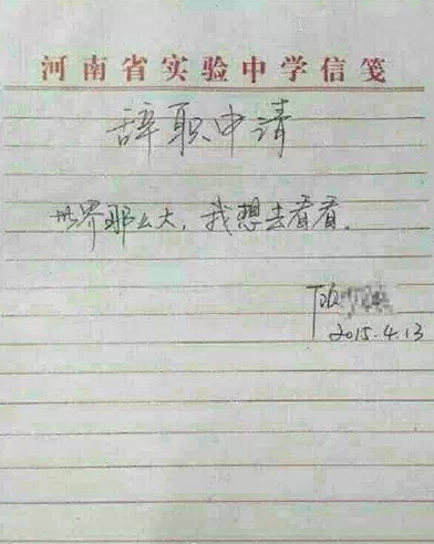 4月14日一早,一封辞职信引发热评,辞职的理由仅有10个字:世界那么大,我想去看看。有人评这是“史上最具情怀的辞职信,没有之一”。经采访得知,作者为2004年7月入职河南省实验中学的一名女心理教师。如此任性的辞职信,领导最后真批准了。