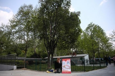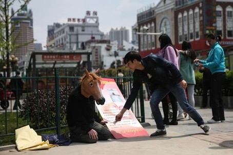 4月13日上午9时,合肥市逍遥津附近,38岁的陈运涛头戴马头面具跪于路旁,旁边竖着一块展板,一行黄字显得格外刺目:骑一次五块,好心人您就骑我一次吧!