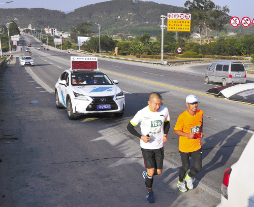 昨日,“挑战100”进入第14天。当天是台州籍极限马拉松挑战者陈盆滨告别广东进入福建境内的首站马拉松。福建共有19站。早上6点,陈盆滨从漳州诏安出发,用时4小时14分58秒抵达漳州市云霄县。当天,央视著名篮球评论员于嘉陪跑。陈盆滨和于嘉一路上“高谈阔论”,完成“相声式马拉松”。陈盆滨表示,“经过一段时间的适应,目前的身体状况良好。”