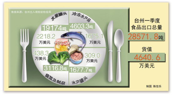根据台州出入境检验检疫局最新数据显示,今年一季度,我市出口食品1154批、2.85万吨,货值4640.6万美元。