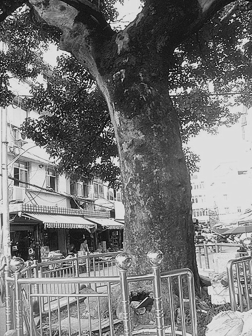 这棵被称为“树神”的重阳木如人一样命运多舛,先是亭山路道路要硬化,它只被留着一小块的土,并且没有采取设置隔离栏杆等保护措施,边上全是水泥路面,然后是一户人家违规建房子,将树的一条支干圈进屋子内,隔了没多久,导致伸进屋内的枝叶枯死。历经800年,如今他已然断枝折臂,南枝干已被砌进了墙里,结果可想而知,北大枝干已被风刮断。他一如风烛残年的老人被他的亲人抛弃,孤独的矗立在那繁华喧嚣的街心。