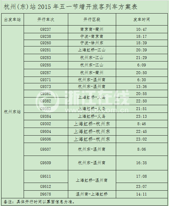 记者了解到,此次增加的16对列车主要由杭州去往上海、南京、徐州、温州、宁波、义乌、衢州、江山等“五一”小长假出行的热门方向。具体车次及开行时间见图表。