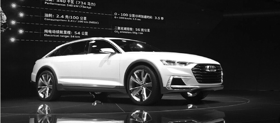 奥迪20余款车型组成的强大产品阵容,还包括3款全球首发车型:奥迪Q7 e-tron 2.0 TFSI quattro,奥迪A6L e-tron和奥迪prologue allroad概念车。其中奥迪A6L e-tron为插电式混合驱动,最大系统功率达180千瓦(245马力),最大系统扭矩达到500牛·米;在混合驱动模式下,总续航里程高达880公里,而百公里平均油耗仅2.2升。