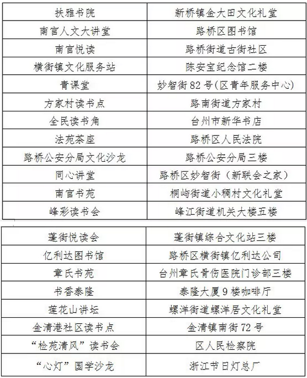 此外,动员会还公布了路桥区二十个读书点,有扶雅书院、南官人文大讲堂、南官悦读、横街镇文化服务站等。届时,市民可前往参与读书交流。