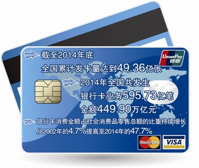 据央行提供的数据,截至2014年底,全国累计发卡量达到49.36亿张,2014年全国共发生银行卡业务595.73亿笔,金额449.90万亿元,银行卡消费金额占社会消费品零售总额的比重持续增长,从2002年的4.7%提高至2014年的47.7%,对便民便商、拉动内需、扩大消费、促进就业和经济发展发挥了重要作用。
