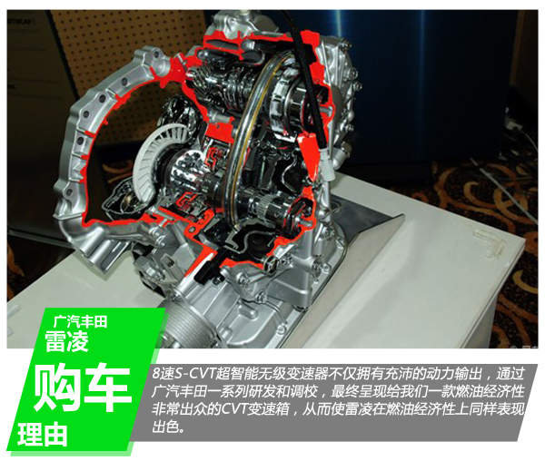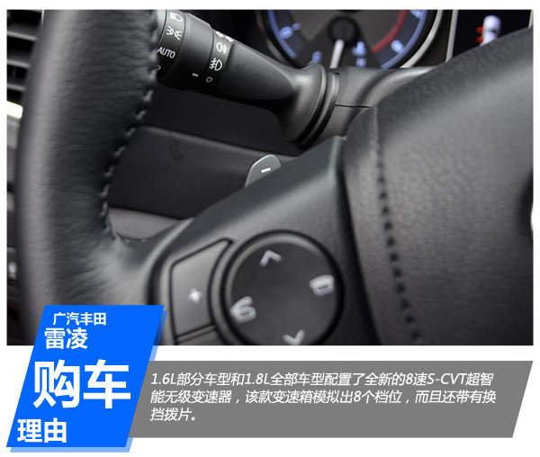 1.6L部分车型和1.8L全部车型配置了全新的8速S-CVT超智能无级变速器,该款变速箱模拟出8个档位,而且还带有换挡拨片。看过休·杰克曼开着雷凌各种闪转腾挪的广告之后,自然会明白雷凌的动力性能毋庸置疑。