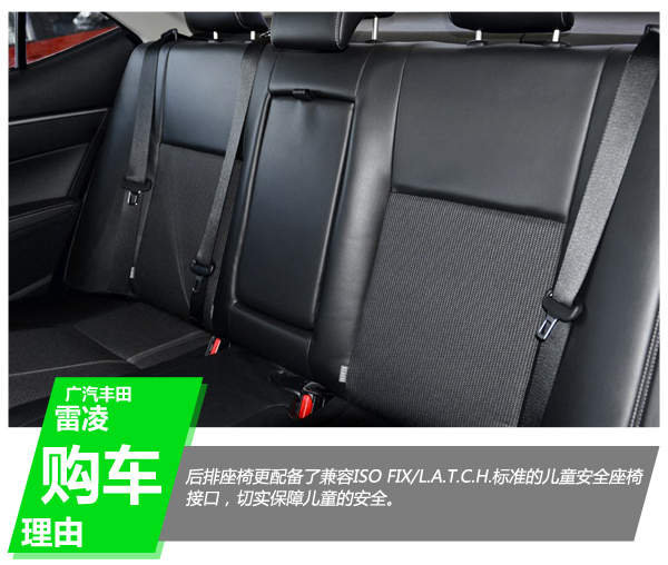 后排座椅更配备了兼容ISO FIX/L.A.T.C.H.标准的儿童安全座椅接口,切实保障儿童的安全。这让已为人夫准备为人父的小陈安心选择雷凌、驾驶雷凌。