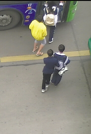 一两个人跑到车门口假装上车,堵住车门。后面,他们的“战友”则在望风、打掩护。其中一个比较瘦小的扒手盯上了一位穿着校服的男生,只见他刻意靠过去,紧挨着这位中学生,两只手则伸入了对方的上衣左口袋,几秒钟时间,男生的手机就被偷走。得手后,小偷立刻将手机放入他的外套内口袋,朝公交车后门方向离去,并继续等候下次作案机会。