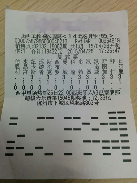 4月26日,传统足彩胜负游戏第15062期全国送出5注一等奖,单注奖金为185万多元,其中1注花落杭州凤起路的02132体彩销售网点,算上14注二等奖,中奖彩民收获总奖金达211万余元。