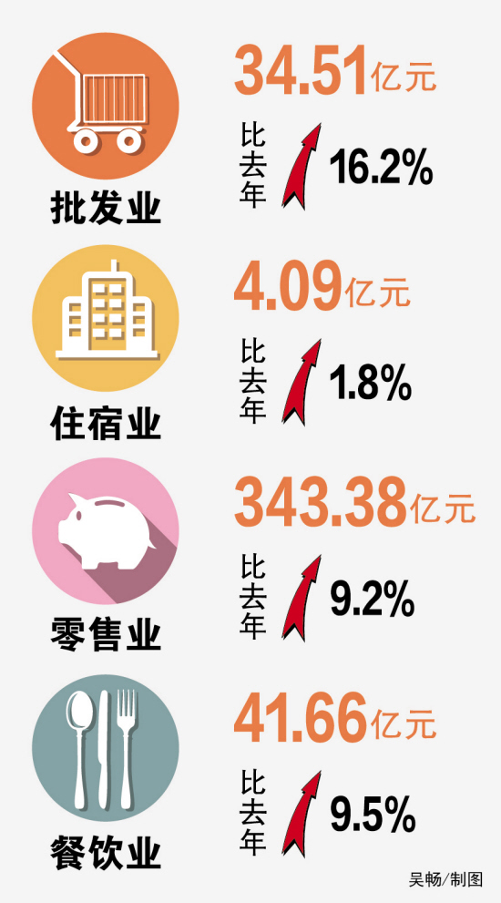 从行业分类来看,批发业和住宿业有所回暖,零售业和餐饮业有所回落。一季度,我市批发业和住宿业分别实现零售额34.51亿元和4.09亿元,分别比去年同期增长16.2%和1.8%,增幅分别比去年同期提高3.2个百分点和4.1个百分点。零售业和餐饮业分别实现零售额343.38亿元和41.66亿元,分别比去年同期增长9.2%和9.5%,增幅分别比去年同期回落4.3个百分点和3.7个百分点。