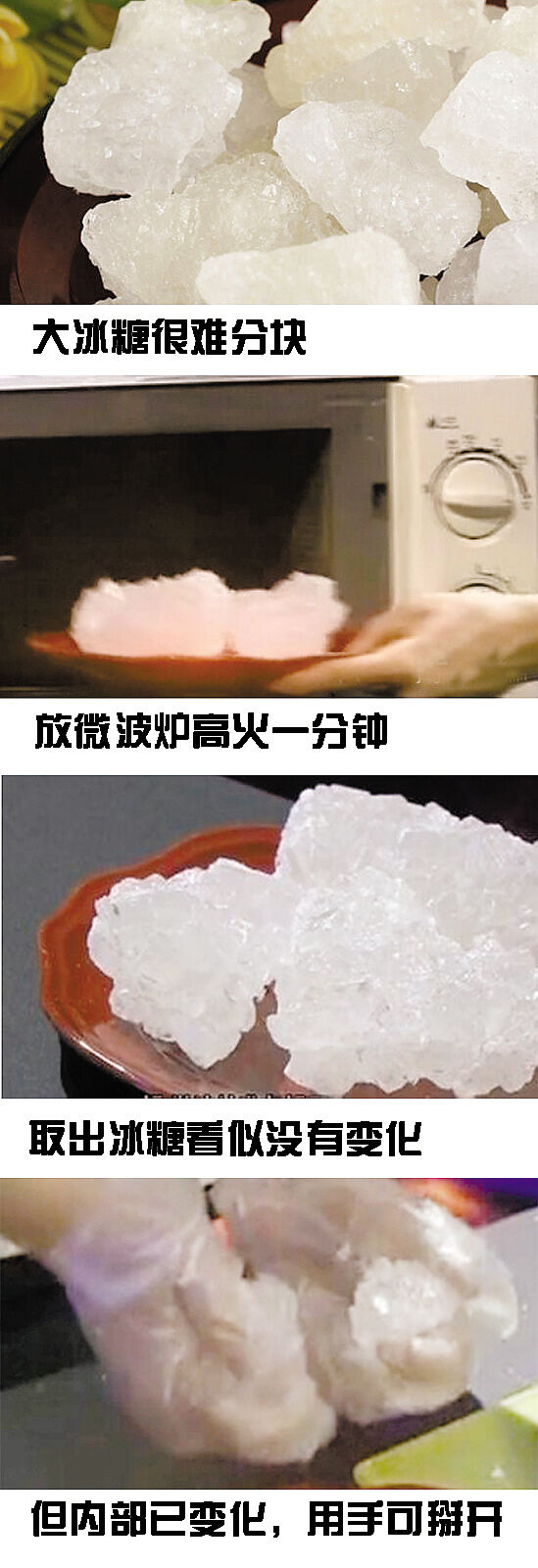 冰糖是市民家中最常用的甜品,可是冰糖往往比较大块,想弄成小块的可不容易。面对大块冰糖时,我们总是无从下手。有人会选择用榔头敲、用刀切,但是效果甚微,而且冰糖碎屑到处飞溅。有读者说,用微波炉就能让大块冰糖轻松分解。