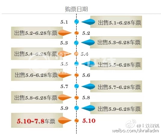另据了解,铁路部门将对暑期列车运行图进行调整,5月1日—5月9日,暂停发售6月29日及以后的车票;5月10日起恢复60天预售期;6月29日-7月7日期间所有列车车票从5月10日8:00起购买。如果你还不明白,看看下面的购票日历就懂了。