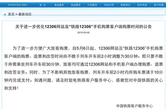 原标题: 5月6日起网购火车票时间延长 发车前30分钟可购票