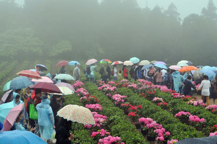 5月10日,众多游客在天台华顶山上共享千年杜鹃花海盛宴。据了解,天台山主峰华顶,海拔1098米,云锦杜鹃就生长在古木参天、异花遍地的华顶国家森林公园。华顶山上的云锦杜鹃树高四五米,枝干有碗口粗细,苍干如松柏,花姿若牡丹,平均树龄约有200年,最老一棵1000岁,堪称华夏一绝。