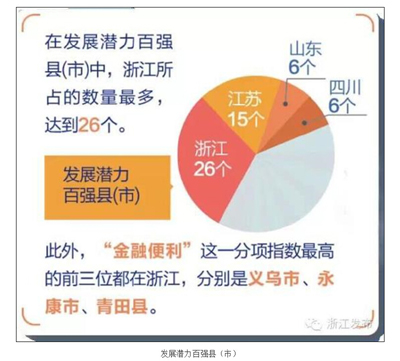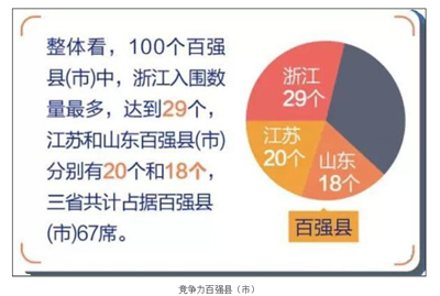 近日,中国社会科学院财经战略研究院在京发布《中国县域经济发展报告(2015)》。报告显示,浙江入选竞争力百强县(市)和最具发展潜力百强县(市)的数量均居全国第一,分别为29个和26个,数量占绝对优势。