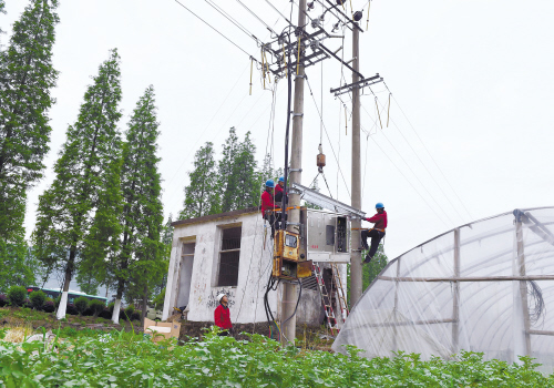 5月14日,在临海市尤溪镇的田野上,来自该市江南供电所的十多名电力工人正在立杆塔、架电线、装横担、放变压器,将125KVA增容到315KVA。