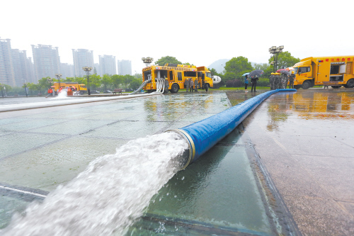 5月14日,来自市级以及椒、黄、路三区的4辆排涝抢险车在市民广场进行排涝抢险演练。去年,全市共购置了10辆排涝抢险车,用于城市排涝抢险,每辆抢险车每小时可抽水1000立方米以上。